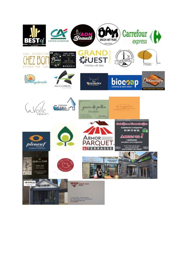 Aux entreprises mécènes Maison Impertinence, Armor Parquet, Biocoop, La Voile, Accords et Eclats, Best of, Biscuiterie de la Côte d’Emeraude, Salon de la plage, Librairie l’Obèle, Galettes et Fourchettes, Grain de Pollen, Ty Tea et les sens, Carrefour Express, Crédit Agricole, Garage Danet, La Vagabonde, Val décor, Constructions Le Gall, 6 saveurs, Pharmacie Joulan-Servin, Point Vert, Les Ricamouches, Chez Bon, Pharmacie Balan, ADN Beauté, Ker vape, Grandouest.
